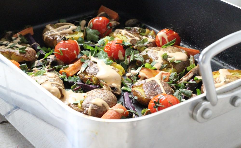Add the tomatoes (any any other veggies you like) around the potatoes and drizzle with the 3 tbs of olive oil and give a good sprinkle with salt & pepper. Pop into the oven for 20-30 mins until the potatoes are starting to crisp and the tomatoes are blistered then remove and set aside.